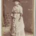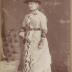 Cabinet format photograph depicting a young woman in a photographer's studio leaning on a tufted chair. She is represented in a light colour dress with pleated underskirt, embellished with lace and ribbons going vertically in the center from the collar to the bottom. The gown is accentuated on the waistline with a dark belt with a large openwork rectangular belt buckle, and a pocket watch chain is attached on the side. She is wearing a pair of fingerless gloves, a different bracelet on each wrist, a feather hat, and is holding a folded fan.