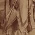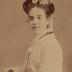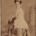 Cabinet format photograph depicting a young woman standing on a photographer's studio background, leaning on a chair, in a long dress, in a transitional between the crinoline and the bustle style, with a medum large skirt with assymetrical layers, trimmed with pleated ribbons, and wearing a short jacket, covering the hips. The lady is holding an umbrella in her left hand, and there is a long fan hanging on a rope under the jacket. Her updo hairstyle is covered with a small hat, embellished with flowers, she is wearing a simple bangle bracelet on her right wrist, and a beaded necklace on her neck, under a ruffled collar.