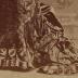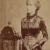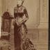 Elongated cabinet format photograph, also called "Boudoir format", depicting a young woman standing in a photographer's studio, leaning on a carved wooden chair with Medieval style tapestries. The lady is wearing an evening reception gown, most likely created by the House of Worth, consisting of a silk long sleeved bodice and a tight skirt, with a long train and a small bustle on the back. Both are richly decorated with glass beads, beaded fringes, layers of pleated ribbons, and a wide horizontal line on the knee level of different fabric, with leaf pattern. The high ruffled collar is made of semi transparent tulle and also embellished with beads. The woman is wearing a pair of leather gloves, and holding a closed fan with a silk tassel on the handle.