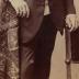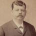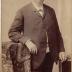 Elongated cabinet format photograph, also called "Boudoir format", depicting a man with mustache, standing in a photographer's studio, leaning on a chair and a pedestal table, covered with a tapestry cloth. the gentleman is wearing a suit, consisting of a jacket and a trousers, a white shirt under it, with a bowtie hidden under the collar, and a large ring on his right hand.