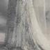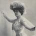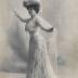 Paper photograph of a Parisian model of Maison Delisle, destined for a German magazine. The photograph shows a young woman dressed in an evening dress in silk muslin, covered with tulle, richly embroidered with sequins and glass beads, forming a large net pattern on the skirt, made of floral garlands. The bottom lining of the skirt has a large pleated border. The bodice is also adorned with embroideries, along with long and tight sleeves, and the waistline is accentuated with a very large corset type belt with dots made of pearls or beads, fastening on the left side. The lady is holding a large tulle veil behind her, and is wearing a feather hat. A multistrand pearl choker with openwork metal buckles embellishes her neck, with a two strand long pearl necklace going down the decollete till the skirt line.