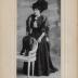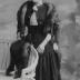 Paper photograph portrait of a wealthy woman, represented in a multi layered outside gown, consisting of a short bolero and a long corset-tight on the waist skirt in thick fabric, with two interlacing waves on the bottom, made of embroidered silk ribbons. A high floral lace collar and two tongue tie are visible under the jacket, pinned with a tea-rose and a metal flower shaped brooch. An openwork metal chatelaine, with four chains, one of each is occupied with a small metal chainmail coin bag with a lace handkerchief inside, is attached on the right side of the belt. A full mink skin is lying on the lady's shoulders, and she is holding another skin fur in her hand, which is leaning on the bench. A chain bracelet adorns her right wrist, and a flat cuff bangle with a tassel is on her left hand. The look is completed with a flat hat, embellished with ostrich feathers, probably jet pins and brooches.
