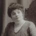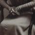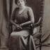 Cabinet format photograph depicting a woman, a famous French actress, Gabrielle-Charlotte REJU, known as Réjane (1856 - 1920). She is represented sitting in a carved wooden chain, in a simple gown consisting of a bodice and a straight silk skirt. The top is made of a striped fabric, with vertical stripes on the bodice, and horizontal stripes on long sleeves, ending with a short pleated cuff. A lace shirt with a high collar is visible under the V-neckline of the bodice, adorned with a short pearl necklace, and a longer thin metal chain necklace with some individual pearls. A pair of small matching pearl earrings is visible.
