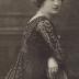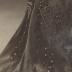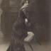 Paper photograph representing a portrait of a young woman in a photographer's studio leaning on a chair, wearing a long evening dress embellished on the sleeves, the back and the front with a transparent tulle net embroidered with large round beads, forming stylised floral patterns. The skirt has a short train and the waistline is accentuated with a large pleated belt. The lady is wearing a set of pearl jewellery consisting of a short one strand necklace and a pair of small round earrings, and multiple stone and dimond rings on her hand, which is holding thin lorgnettes glasses.