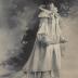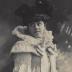 Paper photograph of a Parisian model of Maison Jau, destined for a German magazine, with a printed on tracing paper explanatory text in German. The photograph shows a young woman dressed in a theater gown, consisting of a long white opera coat, gathered on the upper arm, over the chest and back with quilted cords. A short upper cape covers the shoulders and has white lace on bright green silk background, in the same way as the cuffs. White silk muslin hood collar ties at the front with two ribbon bows with long ends made of white silk satin. Beneath the coat, there is a lace dress lined with green taffeta silk to match the cloak. The look is completed with a hat with some openwork metal buckles, and the lady is holding a short cane.