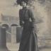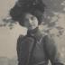 Paper photograph of a Parisian model of Maison Jeulin, destined for a German magazine, with a printed on tracing paper explanatory text in German. The photograph shows a young woman dressed in a sports costume for winter ice skating, consisting of a jacket and a dress in grey-blue homespun wool. The lower edge of the skirt and a small yoke of burnt white taffeta are surrounded by a graceful passementerie — little silver flowers on a white, black-edged satin ribbon. A very short, distinctive bolero is used to get to and from the ice. It has the same passementerie and is bordered by two-finger-wide dark blue velvet stripes. A velvet yoke with a stand-up collar, enlivened by narrow silver borders, and high cuffs on the slightly wide sleeves are very decorative. A deep-blue felt hat, the outer brim of which is made of shaded red roses in full bloom, completes the look, as well as a pair of high Russian leather lace-up boots in deep red color, specifically chosen taking ice skating into account.