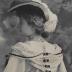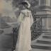 Paper photograph of a Parisian model of Maison Paquin, destined for a German and British magazines, with a printed on tracing paper explanatory text in German, French and English. The photograph shows a young woman dressed in a long dust-cloak, also known as "duster" in a soft white cloth material, which enfolds the figure with scarce a fold in its entire length, and ornamentated at the bottom with a broad hem. The wide loose sleeves fall well over the hands, with a broad double turn back cuff. Shoulderpiece and capuchon are of tucked silk, edged with black velvet and trimmed with pink silk chiffon with tiny forget-me-not clusters. At the back of the hood, and to fasten it in front, are loops of black velvet ribbon with diamond buckles, long ends of the ribbon hang down in front. A hat of black and white straw, covered with black tulle, and having as sole trimming a long white ostrich feather curving down over the hair at the back, is worn with this gown.