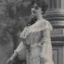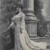 Paper photograph of a Parisian model of Maison Paquin, destined for a German and British magazines, with a printed on tracing paper explanatory text in German, French and English. The photograph shows a young woman dressed in an interior reception gown of grey veiling, with the skirt divided in front by a row of lace inserting, and composed of clusters of tiny tucks, widening out towards the bottom. The flounce, which finishes the skirt has up and down rows of the lace inserting alternating with straight strips of the veiling. The loose bodice is entirely made of inserting and clusters of tucks, the upper part being covered by a lace Berthe fichu with edging of grey chiffon ruffles. The upper sleeves repeat the tucks and inserting of the bodice, the loose elbow puff is of the chiffon. A belt of the same material holds in the bodice at the waist, and a jabot knot of black velvet ribbon loops of varying lengths at the throat embellishes the high collar. A large metal jewel chatelaine is attached to the belt containing keys and medallions.
