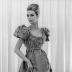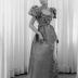 Paper photograph depicting a woman wearing a Pierre BALMAIN creation "FIRENZE" for the autumn-winter 1963-1964 collection, consisting of a long evening dress with flared skirt in bronze faille with metallic effect, the top of the gown and sleeves richly embroidered in flowers, the waistline accentuated with a belt. The model is wearing a pair of light-coloured shoes.