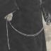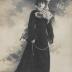 Paper photograph of a Parisian model of French fashion house, destined for a German magazine, with a printed on tracing paper explanatory text in German. The photograph shows a young woman dressed in a hunting coat in sealskin with wide lapels and a chinchilla Stuart collar, and two large buttons entirely made of pearls and turquoise finish at the side. The engageantes sleeves have wide, very far protruding flap with the turquoise silk satin lining of the coat. The large hat is made from chinchilla and has a dainty trimming of white Chantilly tulle and turquoise satin slips. The lady is holding a small fashionable coin purse in chainmail containing a handkerchief, and wearing multiple rings of different styles.