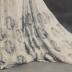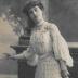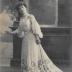 Paper photograph of a Parisian model of French fashion house, destined for a German magazine. The photograph shows a young woman dressed in an elegant home reception dress made of silk muslin with tiny floral embroideries. The finely pleated long skirt with a small train is adorned on the bottom with four horizontal lines of floral wreaths with roses. Loose puffy sleeves are tight on the cuffs with lace, and have lace appliques on the shoulders and parts of the bodice, as well as the high collar, accentuated with two rows of three diamond buttons. The lady is wearing a simple chain bracelet on the wrist, and a ring on the left hand.