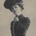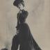 Paper photograph of a Parisian model of Maison Moret, destined for a German magazine. The photograph shows a young woman dressed in an outside autumn-winter gown, with a jacket and a skirt made of thick velvet, with a simple decoration on the bottom of the skirt showing a horizontal brim line creating a loop net on the side. The collar and the cuffs of the jacket have similar net designs. The lady is holding a fur mantle, and wearing a fur hat trimmed with silk ribbons.