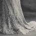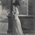 Paper photograph of a Parisian model of French fashion house, destined for a German magazine. The photograph shows a young woman dressed in an elegant evening dress made of silk chiffon entirely embroidered with sequins, forming vertical lines from the bodice to the back of the train. The bottom of the skirt is embellished with lace inserts and flowers made of sequins, with the same motifs repeating on the shoulder straps of medium short loose tulle sleeves. A shiny long tassel decorates the center of the chest, and a multistrand pearl choker necklace, closing with an openwork metal buckle, decorates the neck. The look is completed with an assymetrical hat with standing on the top feathers, and the lady is holding a fan.