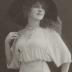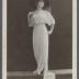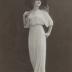 Paper photograph depicting a young woman, a famous French actress, dancer and singer, Arlette DORGÈRE (born Anna Mathilde Irma JOUVE, 8 June 1880 – 1965). She is dressed in a gown by the House of Paquin, consisting of a fully beaded white dress with white liberty train, and short loose sleeves, fluid bodice, slightly accentuated on the waistline. The lady is wearing multiple pearl necklaces of different sizes, the longest are pinned on the right of the chest with a brooch. The look is completed with a large velvet hat with ostrich feather decoration on the back.