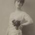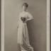 Paper photograph depicting a young woman in a fashionable gown, consisting of an ankle length fluid dress with short sleeves, embellished with a long pleated belt, creating an overskirt open on the side, with embroidered and beaded trimming, and large round buttons on the side of the silk belt on the waistline. The bodice is adorned with a large silk flower, and the lady is wearing a multistrand pearl bracelet on one hand, and a metal chain bracelet with some individual pearls on the other.