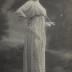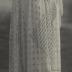Fashion photograph depicting a young woman modeling a "Tulle-bi-telli" dress made of net fabric of light colour with small pieces of metal hammered flat, forming a geometric pattern of rhombi, zigzags and stylized crosses. The bottom of the skirt and the cuffs of the short loose sleeves are embellished with shiny fringe trimmings. The gown has a high, under chest waistline, and the lady is wearing a long pearl necklace.
