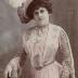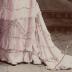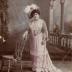 Paper photograph, enhanced with watercolour, depicting a young woman, standing in a photographer's studio, leaning on a rattan chair, and wearing a summer gown in fluid fabric with light striped pattern on the skirt. A wide ruffle crosses the knee level, with golden border, a zigzag ornament goes under this ruffle, and the skirt ends with two more horizontal ruffles on the bottom. The bodice is made of fine lace, with pink vertical ribbons, and the sleeves are long and loose on the bottoms. A hat, embroidered with sequins and decorated with ostrich feathers, completes the look.