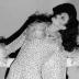 Paper photograph depicting a woman wearing a House of Dior creation for the spring-summer 1975 haute couture collection "Impressionism for Christian Dior", created by Marc BOHAN. The gown consists of a "pointillist" dress and jacket in blue and white silk crepe picked out with South African ostrich feathers in matching tones. Elegant square neckline for the dress with a pleated skirt under a straight jacket with flat pockets. The lady is wearing a jewellery parure, consisting of a necklace and a bracelet, with large white beads, and a bigger blue bead in the center.