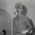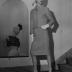 Paper photograph illustrating a fashion model wearing Pierre BALMAIN creation "CORAIL" for the spring-summer 1963 collection, consisting of a suit in coral wool and an orange printed green silk blouse. A turban is designed of the same silk completing the look. The woman is wearing light-coloured gloves and shoes.