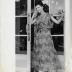 Paper photograph depicting a woman wearing a House of Dior creation consisting of a long summer dress, in semi transparent fabric with washed floral print, with no sleeves, accentuated on the waistline with a matching belt, and fastening on the bodice with two round buttons in the center, under a deep V-neckline framed with large lapels. The model's hair is attached in an updo style forming multilayered waves, she is wearing a pair of large faceted stone earrings, a jewellery parure with a necklace and a bracelet, made of multiple vertical pending strands of rhinestones. The look is completed with a pair of pointy toe heels.
