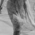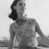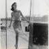 Paper photograph depicting a woman wearing a House of Dior creation consisting of a knee-length sleeveless summer dress, in semi transparent fabric with floral print, oval neckline and accentuated on the waistline with a matching long belt. The model is wearing a pair of large round earrings, a jewellery parure with a necklace and a bracelet, made of multiple strands of beads of different sizes, shapes and colours. The look is completed with a pair of classic heels.