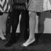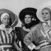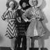 Paper photograph depicting three women wearing a House of Jacques Esterel creations for the spring-summer 1972 collection. The model on the left is wearing a striped shirt dress with a matching corselet belt, ice collar, pussycat bow, round hat over the hidden under a scarf hair, and red and white shoes. The model in the center is wearing a dress called "to be the opposite of a boy" in black canvas with taffeta inserts, large corselet belt, little poet collar and similar to the first look hat, with a bunch of different sized round pins on the left side of the head under the hat. The woman on the right is wearing a shirt dress in red surah with white polka dots with a matching underskirt, small poet collar and a hat. She is holding a large clutch bag with the fashion house's logo.