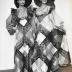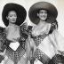 Paper photograph depicting two women, so called twins, wearing House of Jacques Esterel creations for the spring-summer 1973 collection. Each dress is made of silk with scottish surah criss crossed linear patterns, has long and puffy loose sleeves, tight on the wrists, large flounces of fabric framing the shoulders, creating a wing effect. The looks are completed with large round hats.