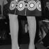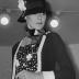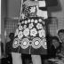 Paper photograph depicting a woman, wearing a House of Jacques Esterel creation for the spring-summer 1974 collection. The lady is modeling a matching set of cardigan and dress with navy, red, white placed designs of flowers, dots of different sizes and circles. The look is completed with a cloche hat with a bunch of flowers on the side, a silk kerchief on the neck, and a pair of shoes with oval toe and chunky rectangular heel.