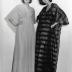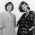 Paper photograph depicting two women, wearing House of Jacques Esterel creations for the autumn-winter 1975-76 collection of "Jacques Esterel Extension" department, launched this year, with the designs made by Christian LEMME GANGA, benefiting from haute-couture techniques but sold at boutique prices. The lady on the right is modeling a high waist chiffon dress, with the shawl closing the bodice and covering the shoulders. The woman on the left is wearing a dress in striped and lamé silk veil, with a matching djellaba over it.