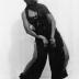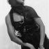 Paper photograph depicting a woman, wearing a House of Feraud creation for the autumn-winter 1978-1979 collection presented during the 39th International Fashion Week in Munich to retail trade. The lady on the photo is modeling a slashed suite made of black silk-mixture embellished all over with pearls and sequins, and a semi transparent veil covers her head. She wears multiple rings and a shiny bracelet.