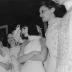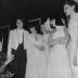 Paper photograph representing Denise POIRET, born Denise BOULET (1886-1982), wife of the famous couturier of the Roaring Twenties Paul POIRET, attending the presentation of the Guy LAROCHE collection. Guy LAROCHE himself is standing behind her with five of his models, wearing evening gowns embellished with sequins, glass beads, and feathers.