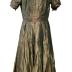 Green silk taffeta dress with pleated bodice, short, gathered puff sleeves, boat neckline trimmed with thin black lace ribbons.