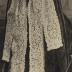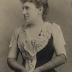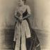 Paper photograph portrait of a woman, represented in a ball room setting, wearing an evening gown, consisting of a deep colour velvet dress embellished on the sleeves, the decollete and the apron with lines of fine lace with floral and leaf patterns. The look is completed with a pair of long gloves, and the woman's hair is curled and attached on the top. The lady is known as Zena OLDHAM married to Randolph BRANDT, lived at Upper Main Street in Waterville, Maine, USA.