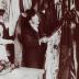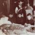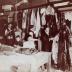 Paper photograph showing the inside of the dressmaker HERMANN studio, with five women seamstresses sitting at the working table with different fabrics lying on it, and three gentlemen standing on the back holding pieces of future gowns and tissues.