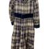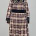 Woolen tartan girl's dress with dark green velvet waistband, cuffs and stand collar, and chest details embellished with beads on the edges.