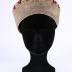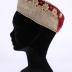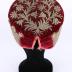 Red velvet traditional Russian kokoshnik headdress decorated with padded silver embroidery, sequins and passementerie. Lined with hand printed cotton with paisleys in lines on the brim, and beige circles on brown background inside the top.