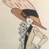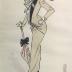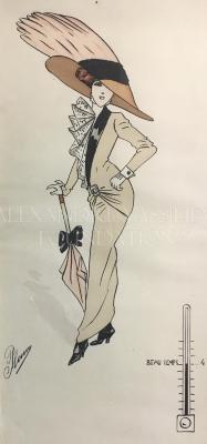 Fashion illustration of a woman in a fashionable tunique and skirt suit in beige fabric, with black lapel and white frills on the jacket top, paired with a large orange and black hat, a pair of black boots and a peach umbrella with a black ribbon detail. The ensemble is indicated by the author to be worn for a good weather with a thermometer drawn in the bottom right corner.