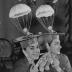 Paper photograph depicting a star model and parachute jumping champion, Colette DUVAL (1930-1988) capping Saint Catherine. She is wearing a festive hat for St.Catherine's Day 1955. In honor of her profession, the hat is made with a female figurine attached to a parachute above which hangs an airplane. The figurine is seated in such a way as to represent that it is landing on a tray representing a runway at Orly airport which constitutes the base of the hat.
