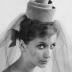 Paper photograph depicting a woman wearing a fashionable headpiece by Italian couturier Cesare Francesca, inpired of siamese royal hats. The headpiece has been made with a pink velour ruban in spiral towering based by a flowing tulle veil anchored by a self bow at back.