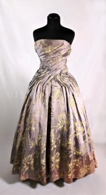 Haute couture evening dress in silver shining brocade with golden flower motifs.