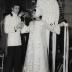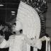 Paper photograph depicting a couture presentation for spring-summer 1968 collection of the French designer Jacques ESTEREL. The photo shows a model wearing a wedding dress in silk gabardine and white guipure coat with pink interlaced ribbons, worn with a high headgown in the shape of a Quetzal helmet.