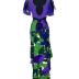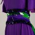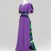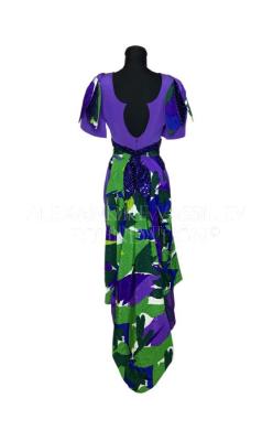 Summer evening gown in purple rayon with short large sleeves with epaulettes. The waist is decorated with sequins and satin abstract motif belt, turning into a train in the same satin on the back.