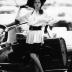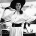 Paper photograph depicting a woman modeling a gown created for spring-summer 1988 collection of the House of Rodier. The look consists of a trapeze cardigan in lightweight wool kasha fabric, buttoned in four places with three small round dark buttons, and a straight knee-length kasha skirt. The top is accentuated on the waistline with a very large belt, fastening on the front. The look is completed with a pair of short gloves, a large hat, and a pair of pumps.