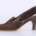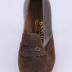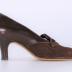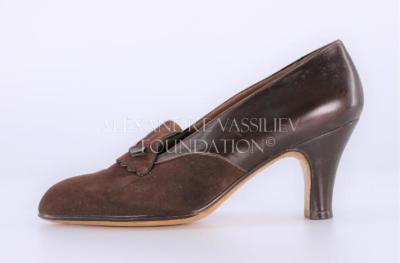 Left foot of a woman's shoe in brown smooth leather and suede leather on a medium size heel. A flap decorated the front of the shoe with a bow.
