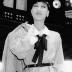 Paper photograph depicting a woman modeling a gown created for spring-summer 1985 haute couture collection of the House of Dior. The look consists of a two-piece suit with a jacket and a dress with vertical striped print. The dress is accentuated on the waistline with a belt. The look is completed with a beret hat, a pair of classic shape pumps, matching the belt with snake pattern, large geometric earrings, and chunky bracelets.