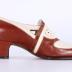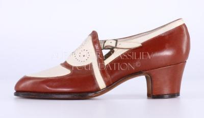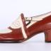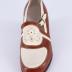 Left foot of a woman's shoe in smooth brown leather and brushed white leather on a little square heel. The shoe is decorated on the bridge of the foot with perforated entrelacs and attached with a tiny golden metal buckle.