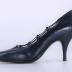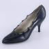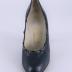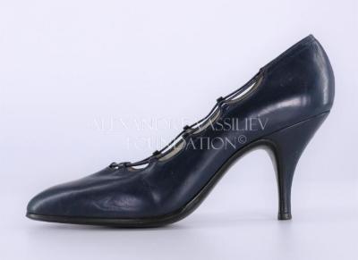 Left foot of a woman's sharp shoe in navy blue leather on a stiletto heel. The rim of the shoe is rippled and a strap goes around the undulations.
