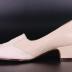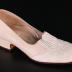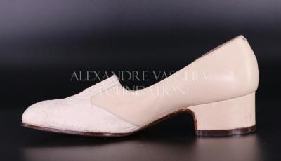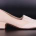 Right foot of a woman's shoe in beige smoothed leather and in white brushed leather on a small and wide heel. The squared tip toe of the shoe is scrunched with machine stitches to create an elastic band.