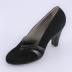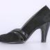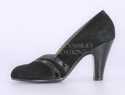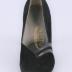 Left foot of a woman's black suede shoe on high heel, decorated with two lines of shiny black leather on the tip toe.
