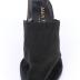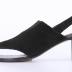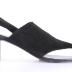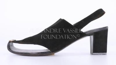 Left foot of a woman's open heel shoe in smoked black velvet with eighteen rhinestones aligned on the tip toe. The shoe is opened on the left and right side of its front part, and the middle size heel is in a square shape.
